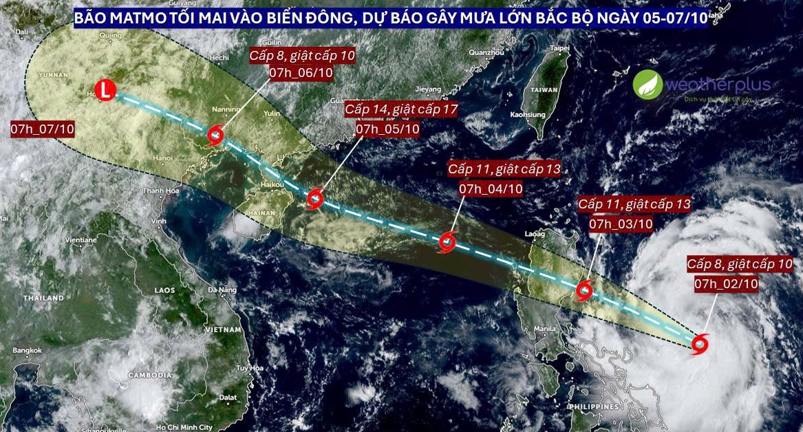 Sáng nay (2/10), áp thấp nhiệt đới phía Đông Philippin đã mạnh lên thành bão số 11 – MATMO. Dự báo tối mai (3/10) bão sẽ vào Biển Đông, gây gió mạnh trên biển và đặc biệt là mưa lớn diện rộng tại Bắc Bộ từ ngày 5–7/10. Người dân cần chủ động theo dõi diễn biến bão để ứng phó kịp thời trước nguy cơ ngập úng, lũ quét và sạt lở.