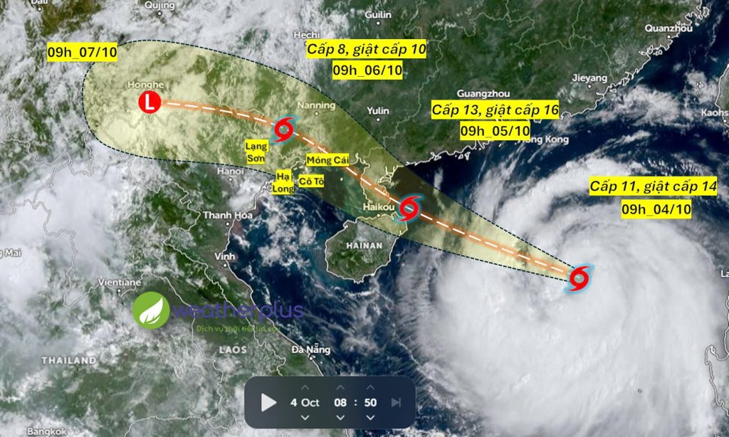 Dự báo bão sẽ mạnh thêm và đạt cấp 13-14, giật cấp 16-17 khi di chuyển tới vùng biển phía đông đảo Hải Nam (Trung Quốc). Đến khoảng trưa mai (5/10) bão sẽ đổ bộ vào bán đảo Lôi Châu (Trung Quốc) rồi đi dọc theo biên giới Việt – Trung và suy yếu dần, ảnh hưởng trực tiếp đến khu vực Đông Bắc Bộ.