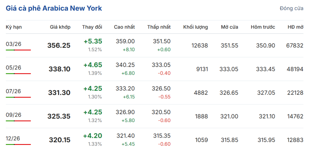 - Arabica New York tiếp tục tăng mạnh, các kỳ hạn +4 – +5 cent, đà tăng lan tỏa toàn sàn.