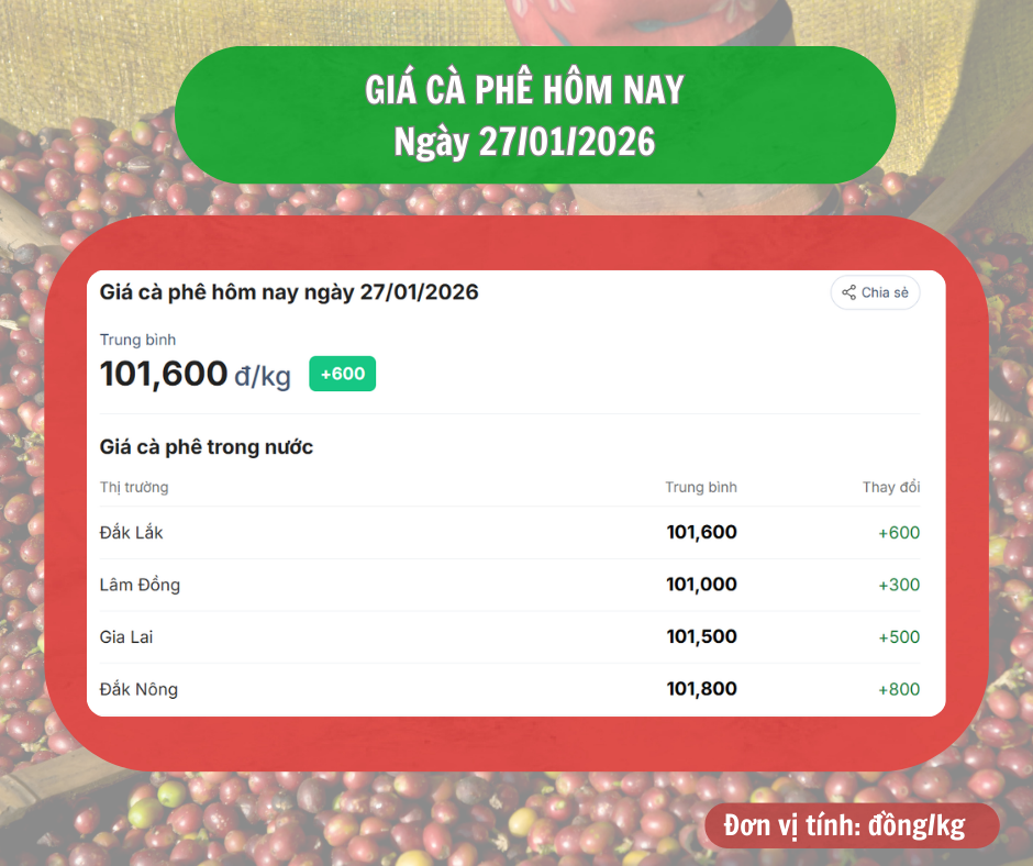 Giá cà phê Tây Nguyên hôm nay 27/1/2026 bứt phá mạnh, bình quân đạt 101.600 đồng/kg, tăng +600 đồng/kg so với hôm qua.