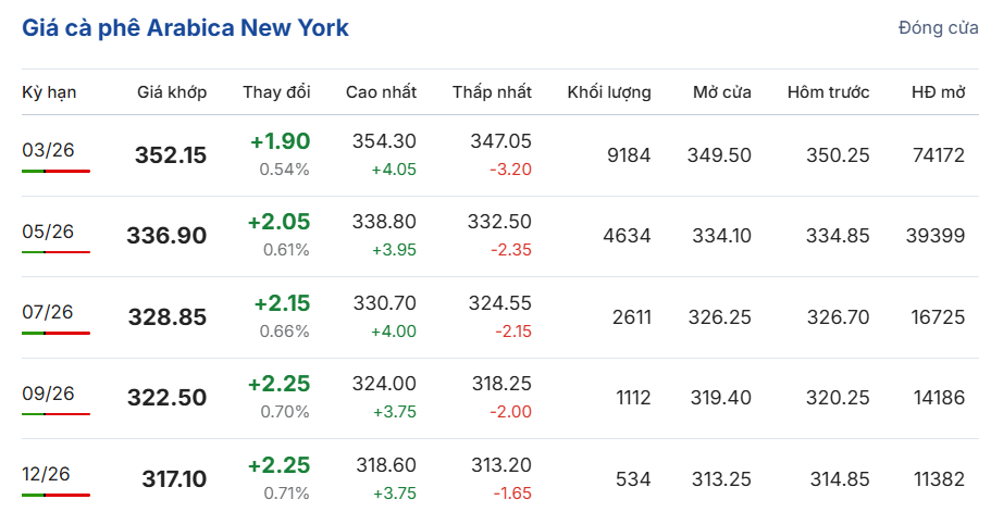 Kỳ hạn 03/2026 tăng lên 352,15 cent/lb, nhích thêm +1,90 cent